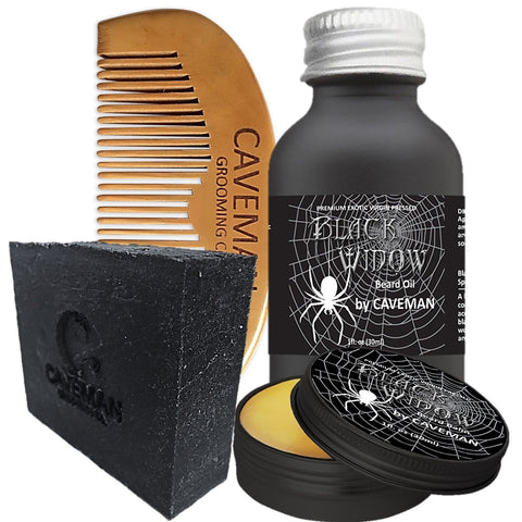 Hand Crafted Caveman Set Includes: 1oz Black Widow Beard Oil, 1oz Black Widow Beard Balm, Charcoal Beard Soap, Handmade Custom Grooming Comb and a burlap, drawstring travel bag. Black Widow scent...
