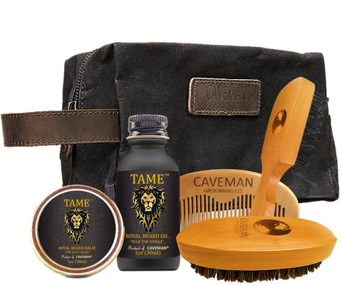 Hand Crafted Caveman "Tame Scent" Holiday Set Includes: Custom Waxed Canvas and Leather Grooming Bag, 1oz Tame Beard Oil, 1oz Tame Beard Balm, Limited Edition Pocket Comb, Pocket Beard brush and Handmade...