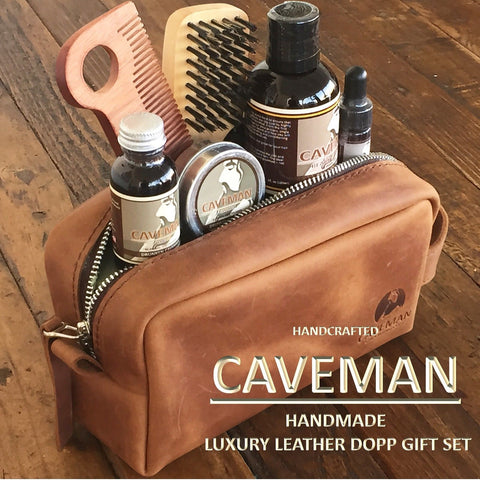 Hand Crafted Caveman Holiday Set Includes: Custom Leather grooming bag, 1oz Beard Oil, 1oz Beard Balm, Beard Wash, Limited Edition Pocket Comb, Single sided brush and a travel size beard...